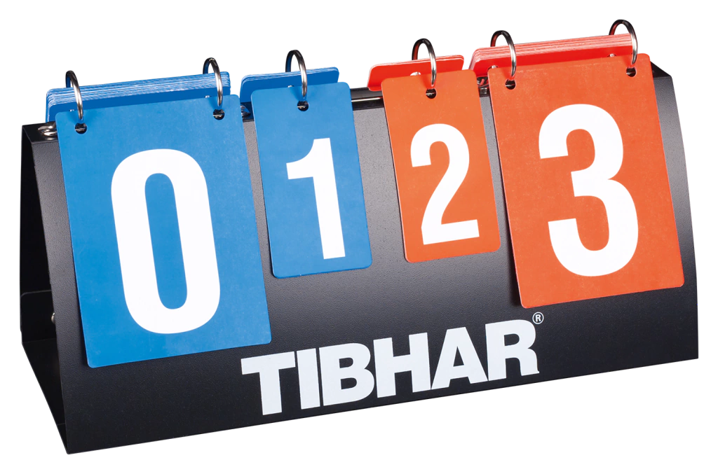 Placar de tênis de mesa dobrável revestido de plástico com números em PVC para marcar de 0 a 20 pontos e 0 a 5 jogos. Os atuais que temos em estoque possuem cartas pretas com números brancos, e para o placar do jogo as cartas são pretas com números vermelhos.