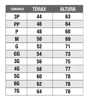 Tamanho | Tórax (cm) | Altura (cm) |